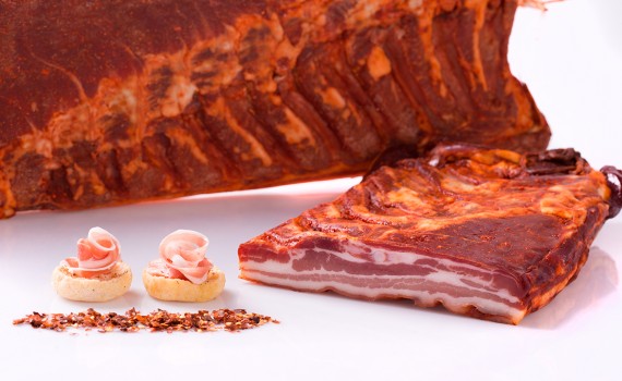 Italská slanina Salumi del Castello Pancetta tesa Piccante je připravována z bůčku, který po dobu až 8 dní ošetřen solí. Poté se slanina potře směsí koření a a nechává se po dobu 30 dní zrát.